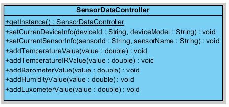Ya teniendo el diseño de cómo va a ser el modelo de datos, el siguiente paso es diseñar qué controladores vamos a necesitar para el manejo de la aplicación y cuáles van a ser de utilidad. Por un lado tenemos el controlador que se encarga de manejar cuando hemos recibido nuevos valores desde los sensores que se observan en la Figura 4.4.1. Este controlador se encargará de procesarlos y llamar a los controladores de Parse y Ducksboard cuando corresponda.